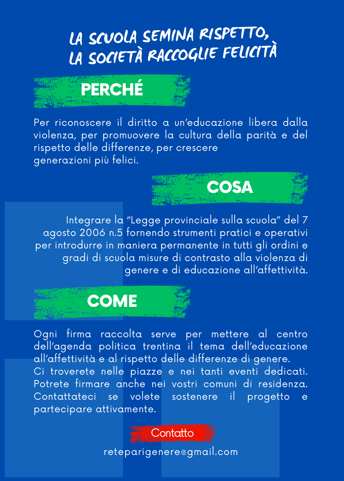 LA SCUOLA SEMINA RISPETTO, LA SOCIETA’ RACCOGLIE FELICITA’ La Rete EducAzione per la Parità di Genere riunisce decine di associazioni, insegnanti, cittadine e cittadini del Trentino con un obiettivo comune: promuovere una legge di iniziativa popolare per portare in tutte le scuole trentine percorsi permanenti di educazione alle relazioni, all’affettività e al rispetto delle differenze di genere. La proposta punta a: formare insegnanti e adulti di riferimento, creare moduli didattici interdisciplinari, coinvolgere le famiglie, costituire un comitato scientifico che garantisca qualità e coerenza dei percorsi educativi. Puoi firmare anche tu! Ogni firma serve per rimettere al centro dell’agenda politica trentina il diritto a un’educazione libera dalla violenza e dalla discriminazione. Puoi firmare nei banchetti, negli eventi in tutta la provincia e nei comuni del Trentino.