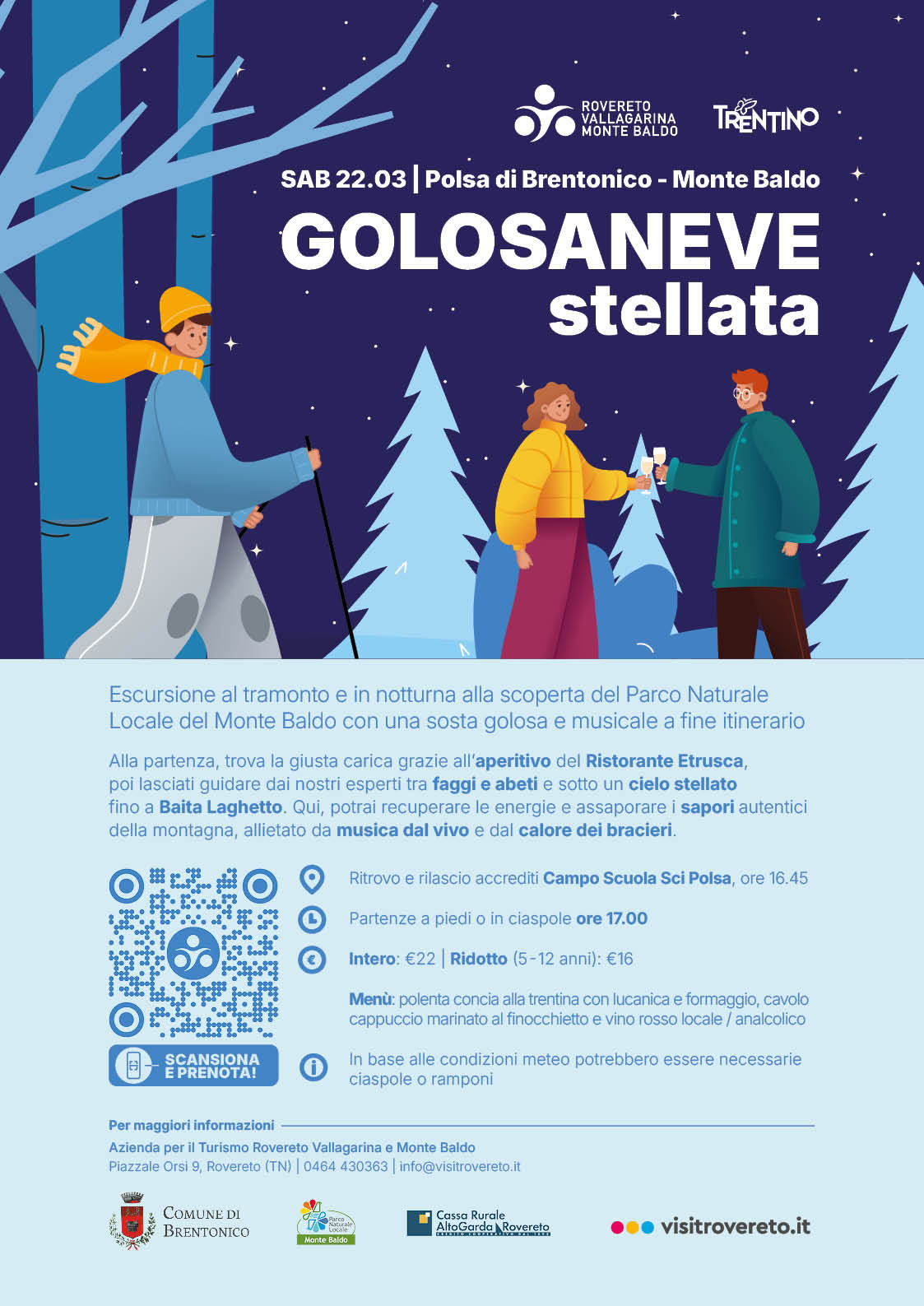 Alla partenza, trova la giusta carica grazie all’aperitivo del Ristorante Etrusca, poi lasciati guidare dai nostri esperti tra faggi e abeti e sotto un cielo stellato fino a Baita Laghetto. Qui, potrai recuperare le energie e assaporare i sapori autentici della montagna, allietato da musica dal vivo e dal calore dei bracieri.