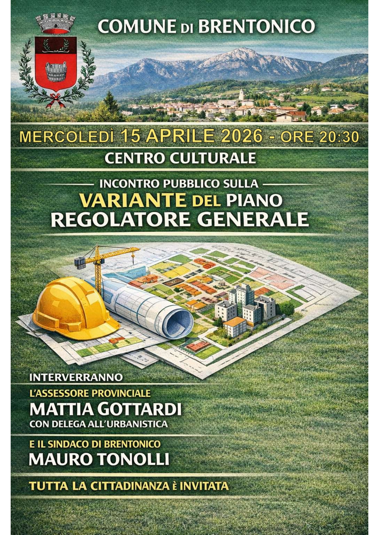 Sarà un’occasione di confronto e informazione sul futuro urbanistico del territorio, con la presenza dell’assessore provinciale Mattia Gottardi, del sindaco Mauro Tonolli e dell’assessore comunale all’urbanistica Alessio Bertolli.La partecipazione è aperta a tutti i cittadini interessati a conoscere e contribuire alle scelte che riguardano lo sviluppo della comunità.